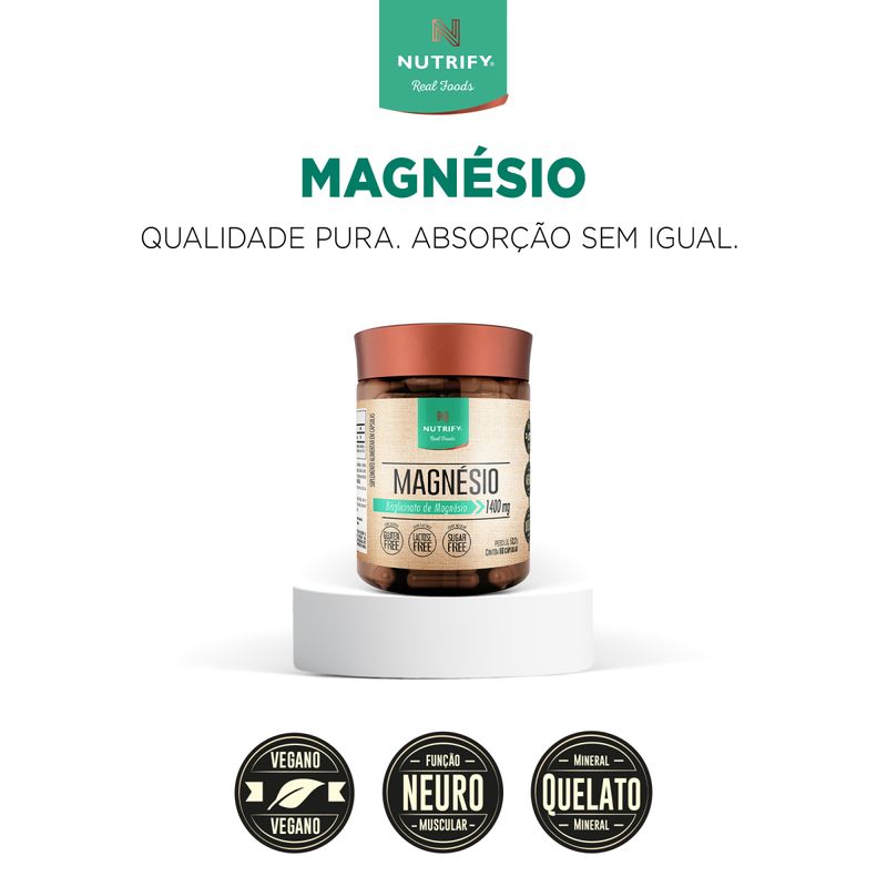 Magnésio Nutrify é um aliado na sua rotina alimentar para a ingestão e absorção de quantidades adequadas de magnésio. Magnésio Nutrify apresenta-se em cápsulas, na forma de bisglicinato, uma fonte altamente absorvível de magnésio (1400 mg de bisglicinato de magnésio fornecem 200 mg de magnésio). Com matéria-prima vegana e cápsulas vegetais, sendo perfeito também para quem não consome ingredientes de origem animal.