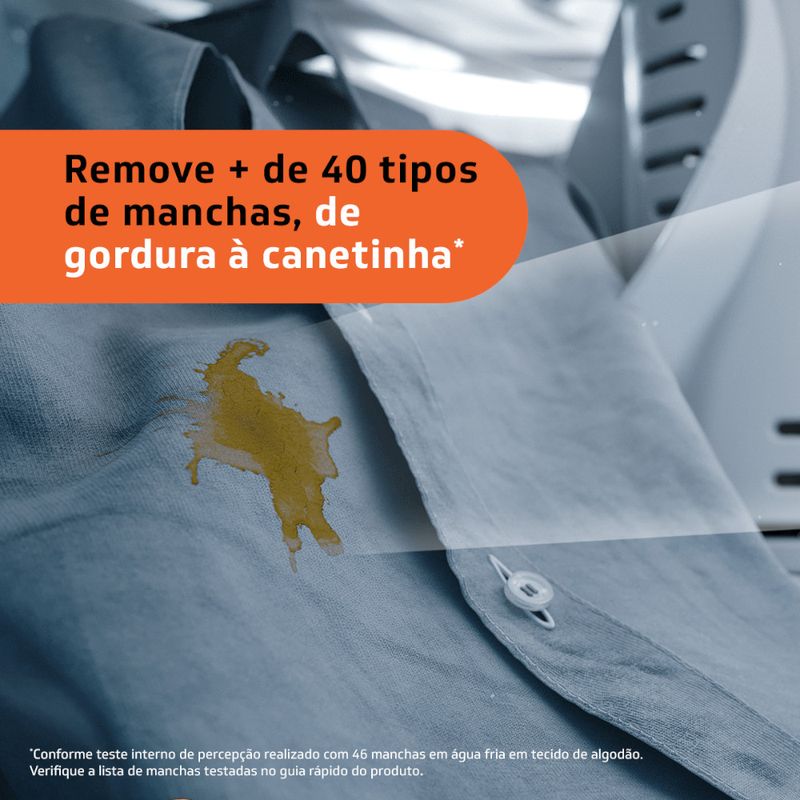 Através do sistema exclusivo de molho e agitação, remove mais de 40 tipos de manchas, como gordura e canetinha, sem danificar os tecidos. Ganhe tempo sem a necessidade de uma pré lavagem!