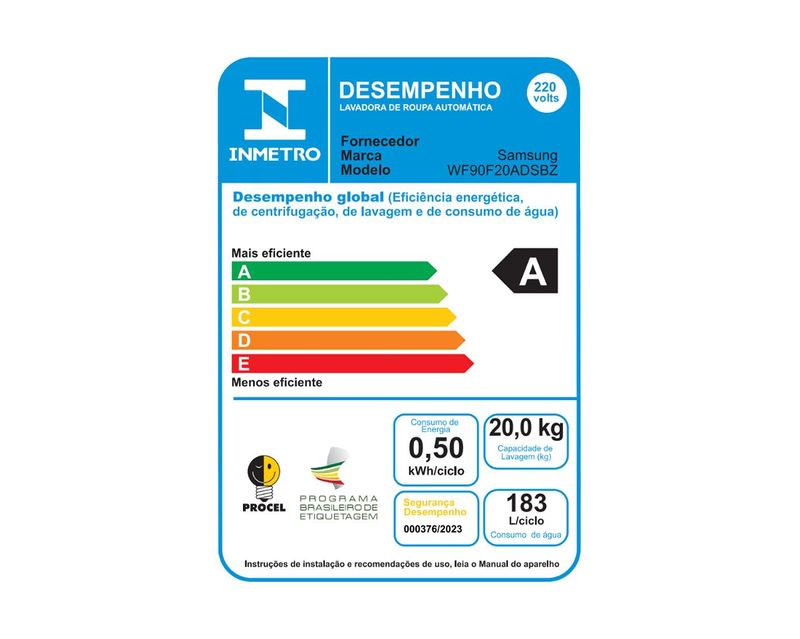 A lavadora Samsung WF90F economiza cerca de 10% de água por ciclo, quando comparado a média do mercado, dentro do segmento acima de 18kg, segundo testes do INMETRO.