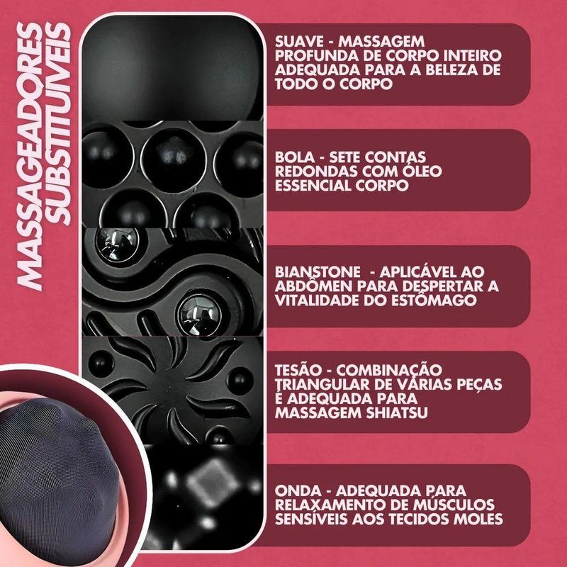 ? Acessórios Interchangeáveis: Inclui 5 cabeças de massagem projetadas para diferentes partes do corpo, garantindo uma massagem completa e eficaz.