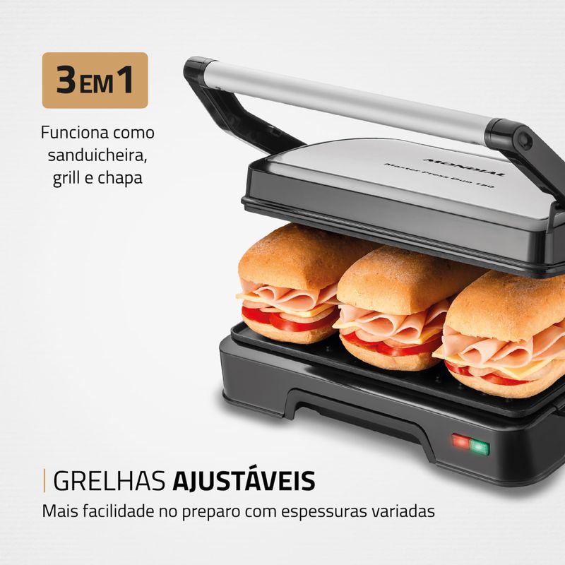 Perfeito para uma rotina com mais sabor e praticidade! O Master Press Duo PG-01-180 possui abertura 180° que garante mais praticidade ao usar as duas chapas ao mesmo tempo. Ele é 3 em 1: funciona como grill, chapa e sanduicheira. Possui revestimento antiaderente e grelhas duplas, que grelham por igual os dois lados do alimento sem grudar. Saiba mais sobre o PG-01-180 da Mondial: