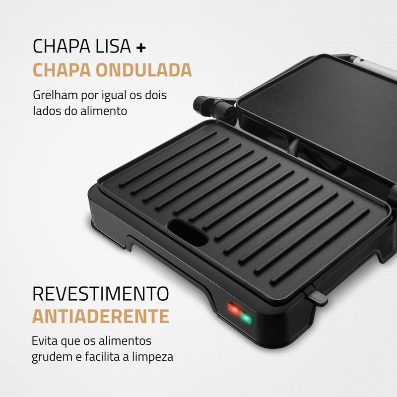 CHAPAS AJUSTÁVEIS: Garante mais facilidade no preparo de alimentos com espessuras variadas.