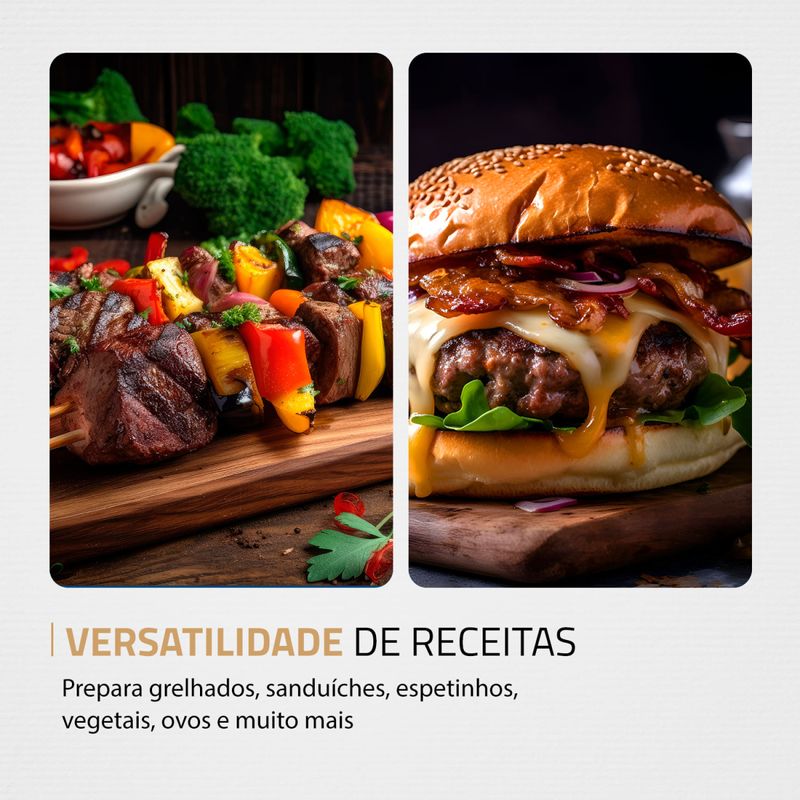 VERSATILIDADE DE RECEITAS: Você pode preparar grelhados, sanduíches, espetinhos, vegetais, panquecas, ovos e muito mais.
