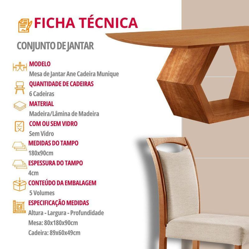 Mesa Ane 180 Tampo Laminado Barril Com 6 Cadeiras Munique Linho Off Imbuia Natural