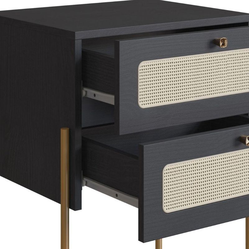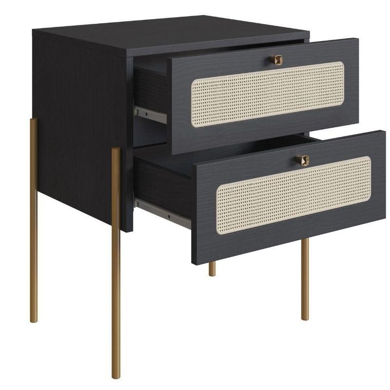 Mesa Cabeceira 2 Gavetas Oslo Artesano 48 Cm (larg) Mdp Nero Palha Sintética Bege Pé Metal Dourado