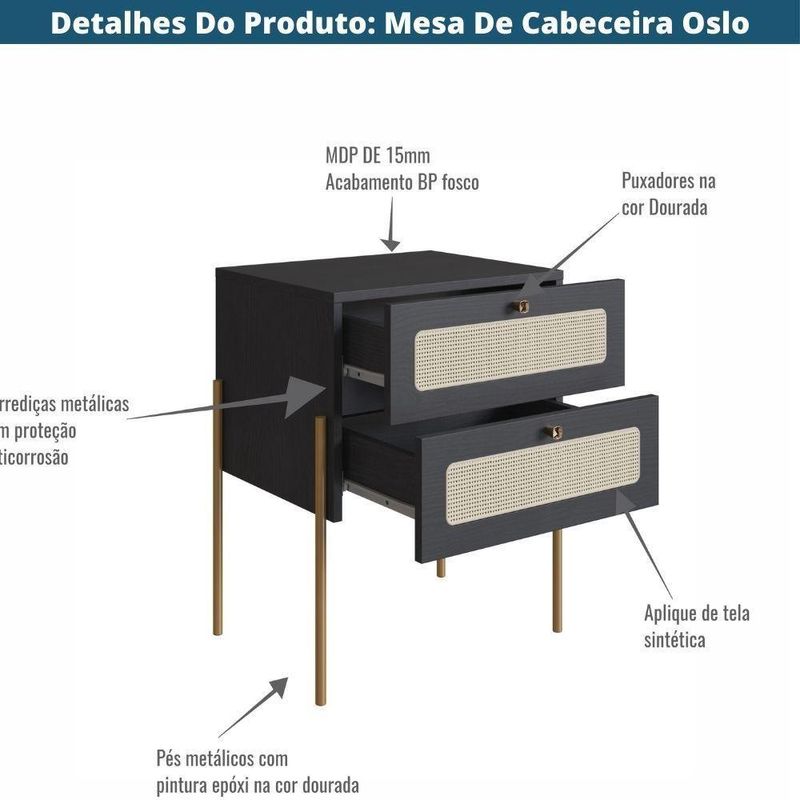 A Mesa de Cabeceira 2 Gavetas Oslo é confeccionada em MDP com acabamento BP, pés metálicos e aplique de tela sintética nas gavetas. Móvel multifuncional, conta com duas gavetas para guardar acessórios, tornando o espaço mais organizado. Traz como característica um traço artesanal, suave e acolhedor. Com design escandinavo minimalista, remete em suas linhas retas a simplicidade, charme e funcionalidade que sua casa merece. Composta com uma paleta de cores neutras, Nero é um acabamento ebanizado atemporal, para quem deseja fugir do tradicional sem perder a nobreza, sofisticação e elegância da madeira, tornando-se assim a opção ideal para um ambiente com toque sofisticado e ao mesmo tempo aconchegante.
