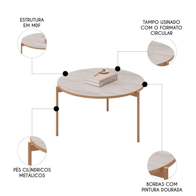 Com design moderno e sofisticado, ela traz leveza ao ambiente, criando um espaço mais elegante e acolhedor para sua Sala de Estar. Seu tampo usinado em formato circular, com borda adornada por pintura PU dourada, destaca ainda mais o requinte do móvel. A estrutura da Mesa de Centro Redonda é reforçada por pés metálicos cilíndricos dourados, garantindo resistência e beleza em uma composição harmônica. Além de ser durável, a Mesa de Centro Para Sala facilita a limpeza e segue as mais atuais tendências de decoração, tornando-se a escolha perfeita para quem deseja transformar o espaço com um toque de sofisticação.