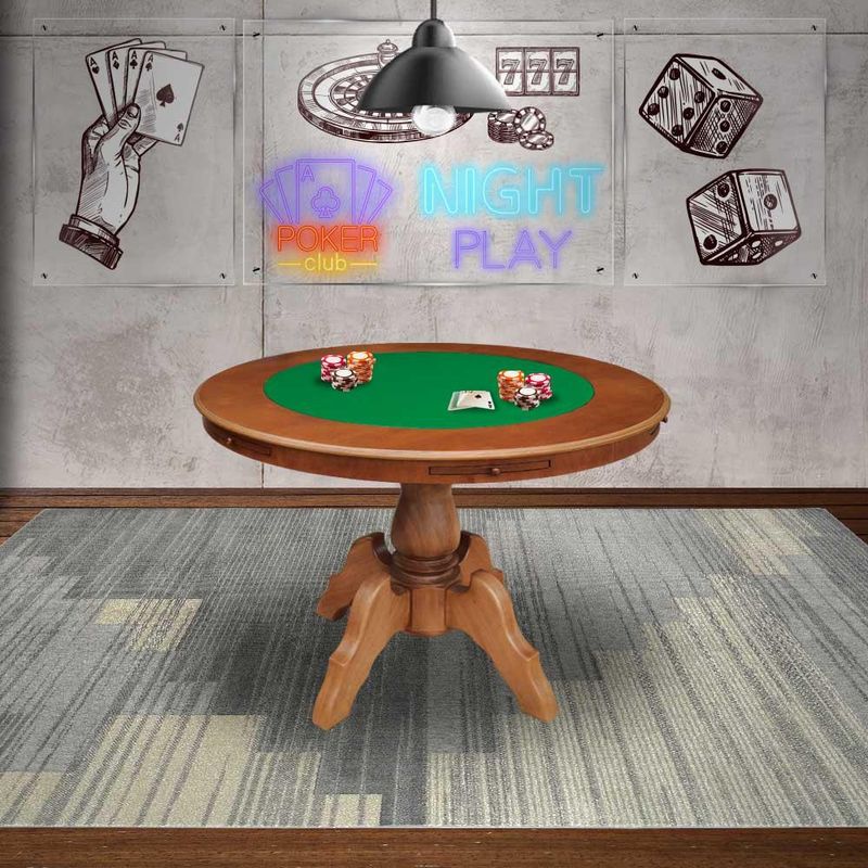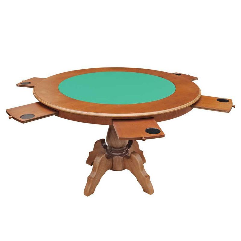 Mesa de Jogos Carteado Redonda Montreal 6 Lugares Tampo Reversível com Gavetas e Porta Copos Amêndoa - Gran Belo confeccionada em madeira maciça de jequitibá de forma artesanal, com compensado e MDF laminado. Possui pintura exclusiva com fundo e verniz, além de detalhes da própria madeira que proporcionam ao produto uma beleza única. Contém gavetas com puxadores em madeira e tampo reversível, possibilitando seu uso tanto para jogar cartas de baralho como para mesa de jantar, conseguindo agregar elegância e praticidade ao ambiente. Dimensões do Produto: