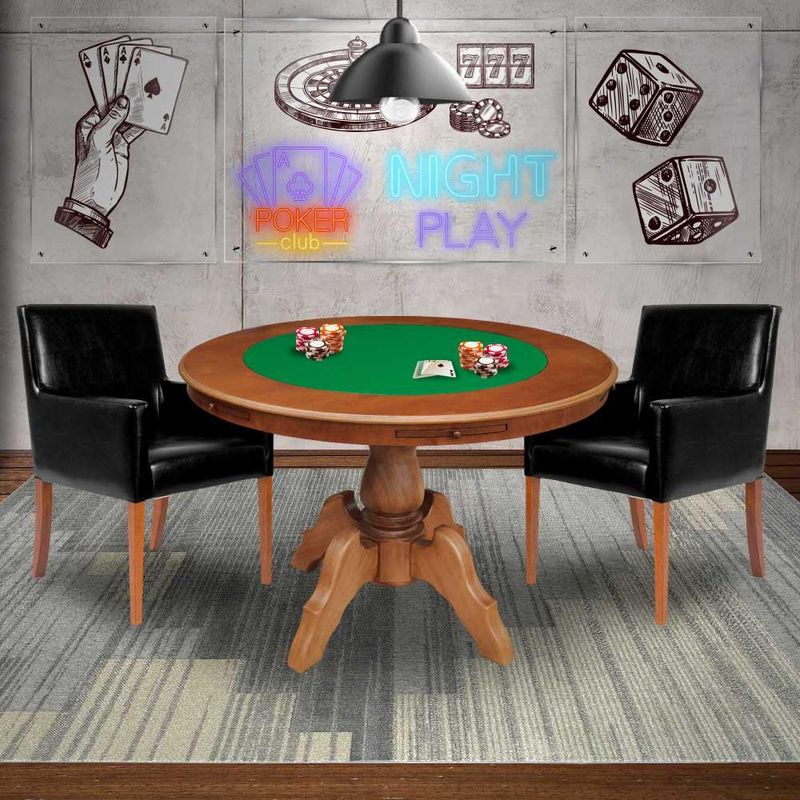 Mesa de Jogos Carteado Redonda Montreal Tampo Reversível Amêndoa com 2 Cadeiras Liverpool PU Sintético Preto Liso - Gran Belo confeccionada em madeira maciça de jequitibá de forma artesanal, com compensado e MDF laminado. Possui pintura exclusiva com fundo e verniz, além de detalhes da própria madeira que proporcionam ao produto uma beleza única. Contém gavetas com puxadores em madeira e tampo reversível, possibilitando seu uso tanto para jogar cartas de baralho como para mesa de jantar, conseguindo agregar elegância e praticidade ao ambiente.