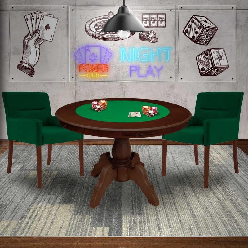 Mesa de Jogos Carteado Redonda Montreal Tampo Reversível Imbuia com 2 Cadeiras Vicenza Verde - Gran Belo confeccionada em madeira maciça de jequitibá de forma artesanal, com compensado e MDF laminado. Possui pintura exclusiva com fundo e verniz, além de detalhes da própria madeira que proporcionam ao produto uma beleza única. Contém gavetas com puxadores em madeira e tampo reversível, possibilitando seu uso tanto para jogar cartas de baralho como para mesa de jantar, conseguindo agregar elegância e praticidade ao ambiente.
