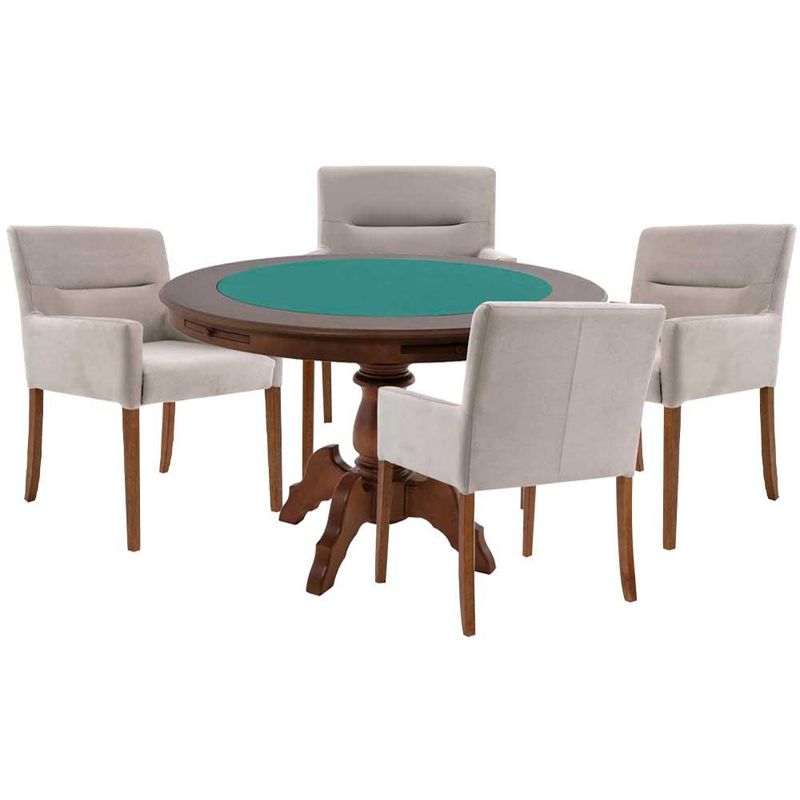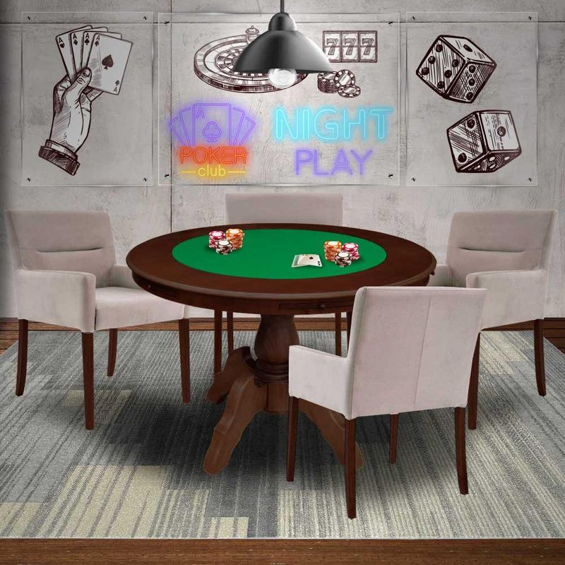 Mesa de Jogos Carteado Redonda Montreal Tampo Reversível Imbuia com 4 Cadeiras Vicenza Nude - Gran Belo confeccionada em madeira maciça de jequitibá de forma artesanal, com compensado e MDF laminado. Possui pintura exclusiva com fundo e verniz, além de detalhes da própria madeira que proporcionam ao produto uma beleza única. Contém gavetas com puxadores em madeira e tampo reversível, possibilitando seu uso tanto para jogar cartas de baralho como para mesa de jantar, conseguindo agregar elegância e praticidade ao ambiente.