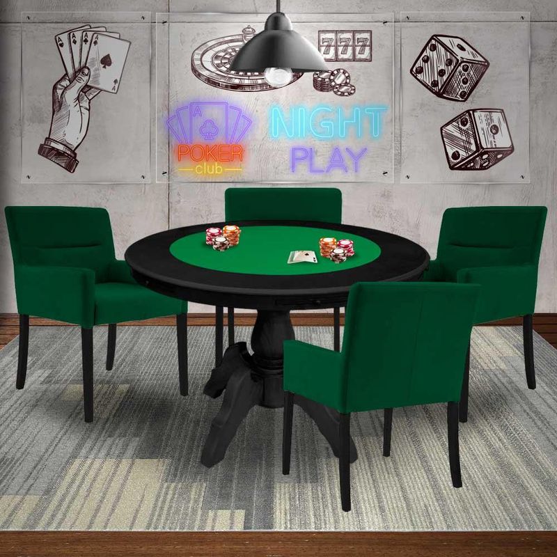 Mesa de Jogos Carteado Redonda Montreal Tampo Reversível Preto com 4 Cadeiras Vicenza Verde - Gran Belo confeccionada em madeira maciça de jequitibá de forma artesanal, com compensado e MDF laminado. Possui pintura exclusiva com fundo e verniz, além de detalhes da própria madeira que proporcionam ao produto uma beleza única. Contém gavetas com puxadores em madeira e tampo reversível, possibilitando seu uso tanto para jogar cartas de baralho como para mesa de jantar, conseguindo agregar elegância e praticidade ao ambiente.