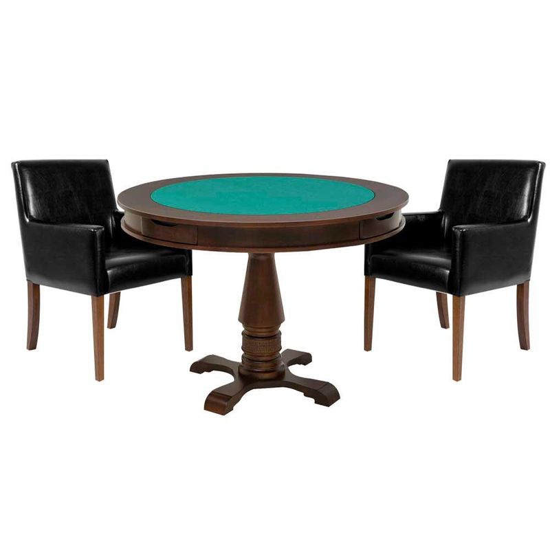 Mesa de Jogos Carteado Victoria Redonda Tampo Reversível Imbuia com 2 Cadeiras Liverpool PU Preto Liso - Gran Belo confeccionada em madeira maciça de jequitibá, compensado e MDF laminado. Possui pintura exclusiva com fundo e verniz, além de detalhes da própria madeira que proporcionam ao produto uma beleza única. Contém gavetas com puxadores em cava e tampo reversível, possibilitando seu uso tanto para jogar cartas de baralho como para mesa de jantar, conseguindo agregar elegância e praticidade ao ambiente.