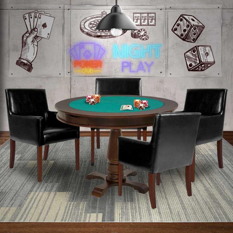 Mesa de Jogos Carteado Victoria Redonda Tampo Reversível Imbuia com 4 Cadeiras Liverpool PU Preto Liso - Gran Belo confeccionada em madeira maciça de jequitibá, compensado e MDF laminado. Possui pintura exclusiva com fundo e verniz, além de detalhes da própria madeira que proporcionam ao produto uma beleza única. Contém gavetas com puxadores em cava e tampo reversível, possibilitando seu uso tanto para jogar cartas de baralho como para mesa de jantar, conseguindo agregar elegância e praticidade ao ambiente.