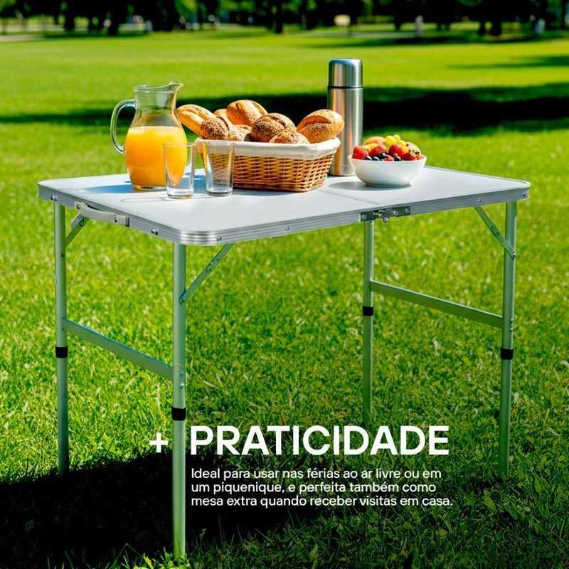 Com estrutura em alumínio reforçado e tampo dobrável em MDF de 4,5 mm, a mesa combina resistência e acabamento sofisticado. Seu design versátil permite ajustar a altura entre 40 e 70 cm, adaptando-se a diferentes usos: desde um apoio para refeições até uma mesa auxiliar para atividades externas.