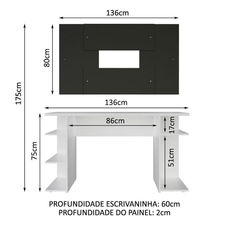 O acabamento da mesa é branco e o painel é preto. O processo é feito com a Pintura Poliéster de sete camadas exclusiva da Madesa, um método ecológico e que oferece maior proteção ao móvel.Itens inclusos: