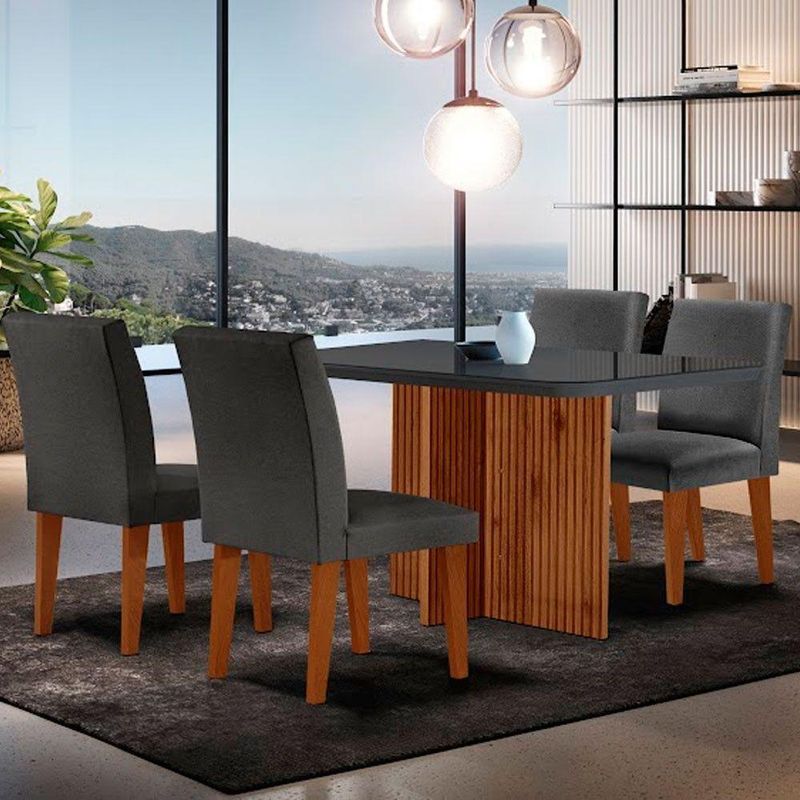 Sala De Jantar Mesa Olimpia 120 Mdf Vidro Canto Copo Com 4 Cadeiras Grecia Grafite/grafite/imbuia Ripado