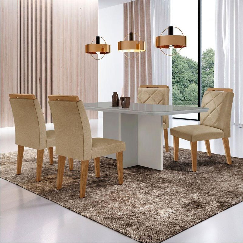 A Sala de Jantar Olimpia, acompanhada pelas elegantes Cadeiras Melissa, transforma seu espaco em um ambiente aconchegante e repleto de requinte. O conjunto, elaborado em MDF, destaca-se pelos detalhes interligados da base, que conferem um charme especial. O tampo de vidro curvo nao apenas embeleza, mas tambem oferece seguranca, especialmente em lares com criancas. As Cadeiras Melissa complementam o conjunto com seu assento e encostos estofados, enriquecidos por delicados bordados no encosto, tornando cada refeicao um momento ainda mais sofisticado e confortavel. E a combinacao perfeita para um jantar memoravel!