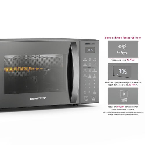 Mais flexibilidade e sabor todos os dias. A Air Fryer integrada ao micro-ondas combina desempenho e rapidez para você ter alimentos crocantes e deliciosos, sem usar uma gota de óleo. Tudo no tempo e no ponto certo, como nas Air Fryers de bancada que você já conhece.