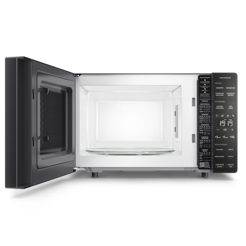 Possui eficiência energética A e função Economia de Energia, que desliga o display quando o micro-ondas não está em uso.