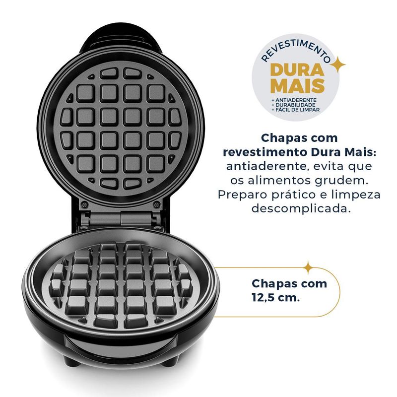 Com suas chapas antiaderentes, você garante um cozimento uniforme e sem grudar, facilitando a limpeza. A potência de 550W garante que seus waffles fiquem prontos em poucos minutos, enquanto a base antiderrapante oferece segurança durante o uso.