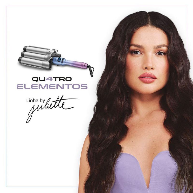 O Modelador de Cachos Triondas da Linha by Juliette Qu4tro Elementos traz um revestimento especial enriquecido com infusão de Cerâmica, Titânio, Tourmaline e Nano Silver. Esses 4 elementos, juntos, protegem seus fios e garantem uma aparência mais saudável aos cabelos. Com o Triondas você pode alcançar aquele cabelo de praia perfeito sem sair de casa. Basta apertar e soltar para obter ondas instantâneas, exuberantes e uniformes. Projetado para oferecer resultados impecáveis em poucos minutos, permite criar ondas marcantes, mas com um resultado despojado e moderno. Saiba mais sobre o MCT-JU-03: