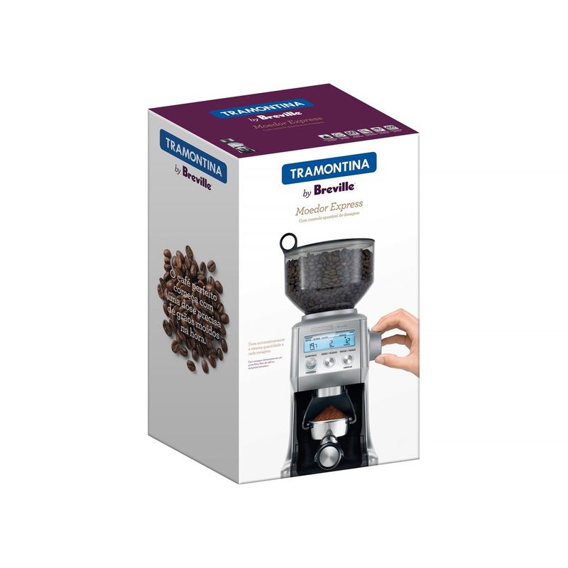 Cada café apresenta notas de sabores diferentes e para um bom apreciador é importante ter instrumentos que permitam que esse momento seja saboreado da melhor forma. Com o Moedor de Café Express em Aço Inox 60 Níveis de Moagem da linha de Eletroportáteis Tramontina by Breville você poderá moer seu café com praticidade, garantindo uma moagem de qualidade. Ele conta com funil de 450 g para grãos. Tela em LCD com retroiluminação exibe o número de doses ou xícaras, a configuração do tipo de moagem e o tempo atual de moagem. Além de 60 configurações de moagem, do mais fino para expresso ao mais grosso para prensa. Limitador de dosagem, o dosador fornece sempre a quantidade precisa. Ajuste manual e programável de dosagem. Moagem sem o uso das mãos. Moedor com brocas cônicas. Corpo em aço inox escovado. Bandeja removível para pó de café, para uma limpeza rápida e fácil. A escolha ideal para quem deseja tornar os seus cafés ainda mais ricos em sabor.