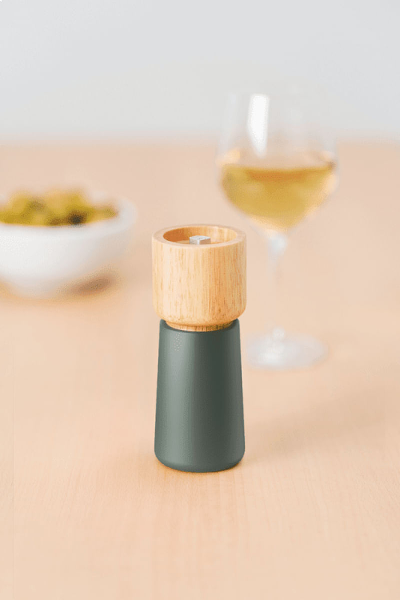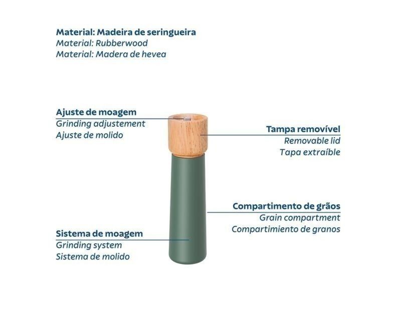 - Moedor em madeira seringueira com pino regulador de tamanho de grão, para que seja ajustado conforme seu gosto.