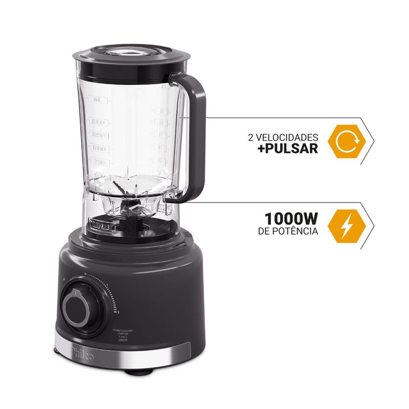 O Multiprocessador Philco 1000W 5 em 1 4 Lâminas Preto PMP10B foi desenvolvido para quem busca potência e versatilidade em um só produto. Com 1000W de potência e 12 velocidades ajustáveis, o Multiprocessador Philco garante desempenho superior para preparar desde sucos e cremes até massas e vegetais fatiados com precisão.