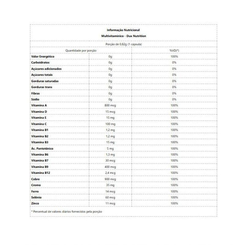 Informação Nutricional Multivitamínico - Dux NutritionPorção de 0,82g (1 cápsula)Quantidade por porção%VD(*)Valor Energético0g100%Carboidratos0g0%Açúcares adicionados0g0%Açúcares totais0g0%Gorduras saturadas0g0%Gorduras trans0g0%Fibras0g0%Sódio0g0%Vitamina A800 mcg100%Vitamina D15 mcg100%Vitamina E15 mg100%Vitamina C100 mg100%Vitamina B11,2 mg100%Vitamina B21,2 mg100%Vitamina B315 mg100%Ác. Pantotênico5 mg100%Vitamina B61,3 mg100%Vitamina B730 mcg100%Vitamina B9400 mcg100%Vitamina B122,4 mcg100%Cobre900 mcg100%Cromo35 mg100%Ferro14 mcg100%Selênio60 mcg100%Zinco11 mcg100%* Percentual de valores diários fornecidos pela porção