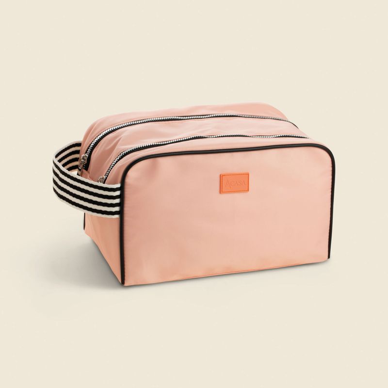 Confeccionada em algodão de alta qualidade, seu design moderno e cor rosa suave trazem um toque feminino e elegante. O fechamento em zíper garante segurança e praticidade, enquanto o formato estruturado facilita o acesso aos seus itens.