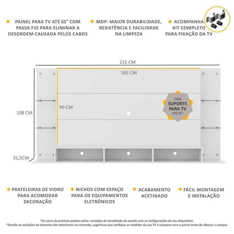Prático e moderno para deixar sua sala de estar confortável para aproveitar o aconchego do seu lar. O Painel até 65 polegadas com suporte e prateleiras de vidro Nairóbi Multimóveis é uma escolha inteligente e super em conta para deixar o seu ambiente bonito e organizado. Produzido em MDP com acabamento acetinado (cerca de 20% de brilho), que garante maior durabilidade, resistência e facilidade na limpeza, possui painel para de até 65” com espaçamento para a passagem dos fios, o que deixa um visual clean e os cabos organizados. Possui 4 prateleiras em vidro, que deixam o móvel mais requintado e 3 nichos para acomodar os equipamentos eletrônicos. Para facilitar a sua vida, este produto acompanha também o kit para fixação da . Muito prático e de fácil instalação, pode ser utilizado para ’s LCD, LED e plasma de 14” a 71”. Totalmente sobreposto, acompanha gabarito de montagem que auxilia na instalação. Conta com um sistema de encaixe rápido, possui 16mm de deslocamento que permite o ajuste do encaixe das peças.