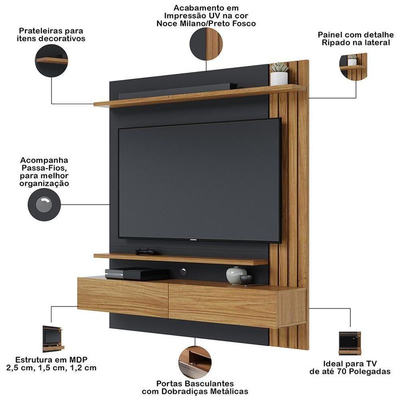 Painel Para Tv 65 Pol Com Bancada Suspensa 150cm Will C04 Noce Milano Preto Fosco - Lyam Decor