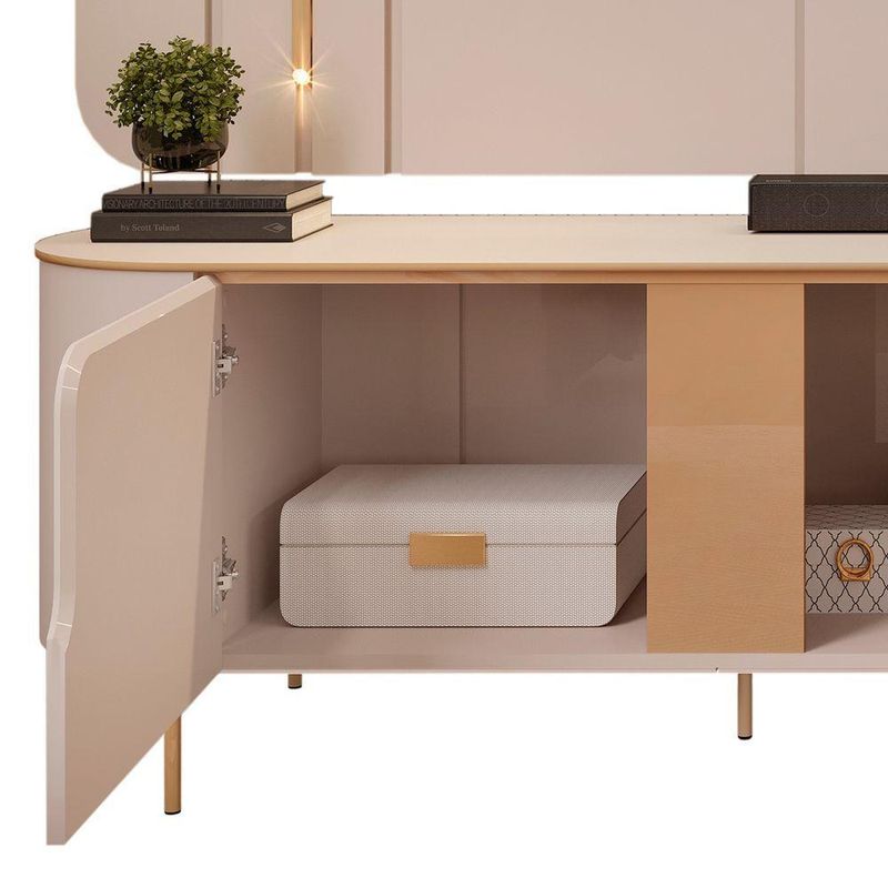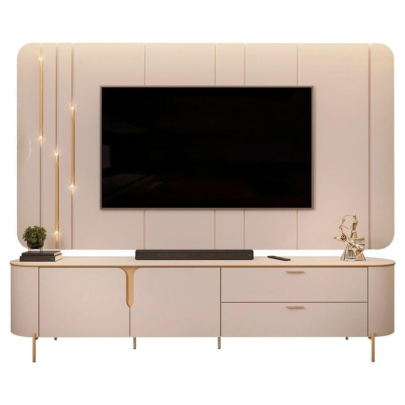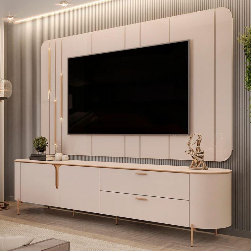 Este Rack Bancada conta com design contemporâneo, laterais e tampo curvados, e detalhes dourados que trazem um ar de luxo. Com duas portas com dobradiças metálicas e gavetas espaçosas, oferece praticidade e elegância para organizar seus itens. Além disso, a estrutura metálica dourada e os pés elevados garantem durabilidade e facilitam a limpeza. Já o Painel Suspenso é o complemento perfeito para este conjunto. Com cantos arredondados e divisões chanfradas, ele acomoda TV de até 75 polegadas com elegância e segurança. O painel possui luminárias douradas, que proporcionam um toque adicional de sofisticação ao produto. Fabricados em MDF de alta qualidade e ecológico, a bancada e o painel são a escolha ideal para quem busca beleza e praticidade.