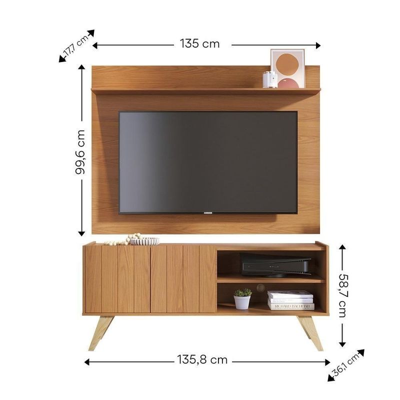 Painel para TV Maia com Rack Space Freijó – Design Moderno e Funcionalidade para sua Sala | Colibri MóveisO Painel Maia com Rack Space da Colibri Móveis é a combinação perfeita de estilo e praticidade para ambientes compactos e modernos. Com acabamento em pintura UV e estrutura em MDP/MDF, o conjunto oferece durabilidade, beleza e funcionalidade. Ideal para salas de estar, o painel suporta TVs de até 47, enquanto o rack retrô com pés em madeira maciça acomoda TVs de até 50, além de oferecer amplo espaço para eletrônicos, livros e objetos decorativos.Características TécnicasPainel Maia:Altura: 99,6 cmLargura: 135 cmProfundidade: 17,7 cmPeso: 16,08 kgEstrutura em MDP 15 mm e 12 mmAcabamento em pintura UVFitas de borda em papelPrateleira superior para decoraçãoSuporta TVs de até 47Rack Space:Altura: 58,7 cmLargura: 135,8 cmProfundidade: 36,1 cmPeso: 19,4 kgEstrutura em MDP 15 mm, MDF 15 mm e HDF 3 mmAcabamento em pintura UVFitas de borda em papel2 portas de giro com frisos decorativos2 nichos abertos para eletrônicosPés em madeira maciça estilo retrôSuporta TVs de até 50Benefícios e FuncionalidadesDesign Integrado: Painel e rack combinam perfeitamente, criando um ambiente moderno e organizado.Funcionalidade: Nichos e prateleiras oferecem espaço para eletrônicos, livros e itens decorativos.Estilo Retrô: Pés em madeira maciça e frisos nas portas valorizam o visual do móvel.Durabilidade: Estrutura reforçada em MDP/MDF com acabamento resistente em pintura UV.Ideal para Ambientes Compactos: Dimensões pensadas para otimizar o espaço sem abrir mão do estilo.Observações ImportantesEvite exposição direta ao sol e à umidade para preservar o acabamento.Para limpeza, utilize pano seco ou levemente umedecido.Imagens meramente ilustrativas. Objetos decorativos e eletrônicos não acompanham o produto.As tonalidades podem variar conforme o monitor.Conteúdo da Embalagem1 Painel Maia1 Rack Space1 Manual de instruçõespainel para TV, rack retrô, rack com portas, rack com nichos, Colibri Móveis, painel com prateleira, rack com pés de madeira, móveis para sala, painel e rack freijó, móveis compactos, decoração modernaAltura: 99,6 | Largura: 135 | Profundidade: 17,7 | Modelo: Maia + Space | Marca: Colibri Móveis | Tipo de Produto: Rack e Painel | Requer Montagem: Sim | Inclui Manual de Montagem: Sim | Quantidade de Caixas de embalagem: 2 | Fabricante (manufacturer): Colibri Decor | Certificação de teste externa (external_testing_certification): Não aplicável | Cor (color): Não aplicável | Número do modelo (model_number): Não aplicável | Número da peça (part_number): Não aplicável | Fonte de energia (power_source_type): Não aplicável | Principais Características do Produto 2 (bullet_point#2): Rack e Painel | Principais Características do Produto 1 (bullet_point#1): MDP | Principais Características do Produto 0 (bullet_point#0): Pintura UV | Quantidade de itens (number_of_items): 2 | Componentes incluídos (included_components): Não aplicável | Is Fragile (is_fragile): Sim | Dimensões do item P x L x A: a | Peso: 16,08 | Baterias são Necessárias?: Não | Formato do móvel: Rack com painel | Cor: FREIJO