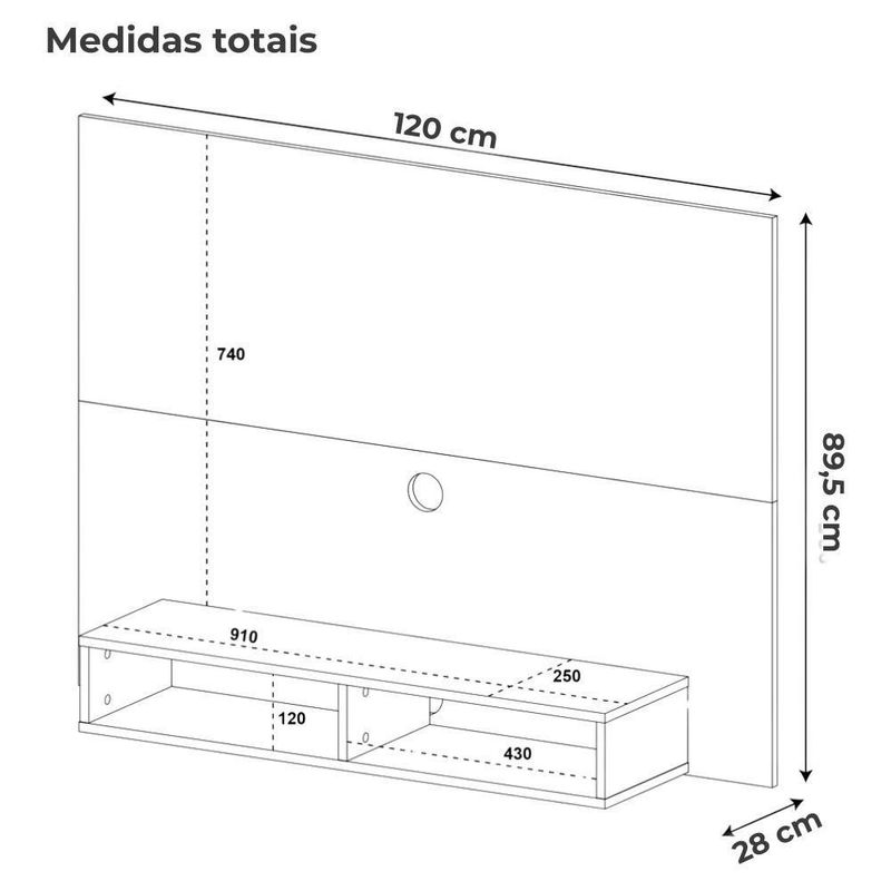 Painel Suspenso ASHDesenvolvido para acomodar sua TV e eletrônicos com estilo e funcionalidade. Suporta com segurança televisores widescreen e ultra widescreen de até 50. Estrutura em MDF/MDP de 15 mm, com 2 nichos abertos e 1 ampla prateleira. Acompanha suporte para TV, passa-fios em plástico ABS e acabamento em pintura UV texturizada (fosco e brilho), de longa durabilidade e fácil limpeza. Produto entregue em 01 volume.Dimensões:
