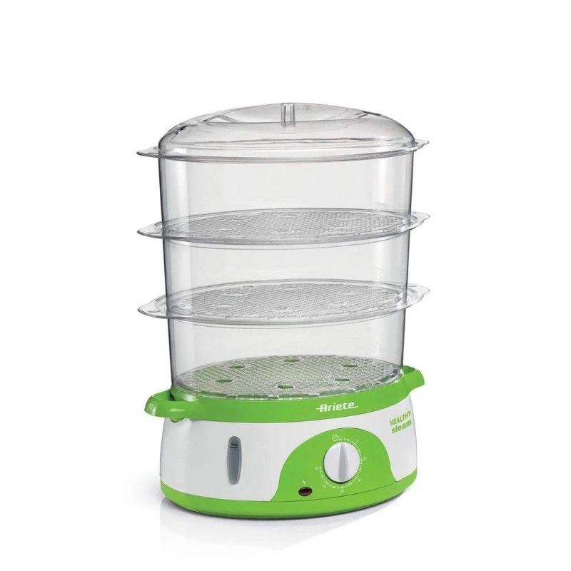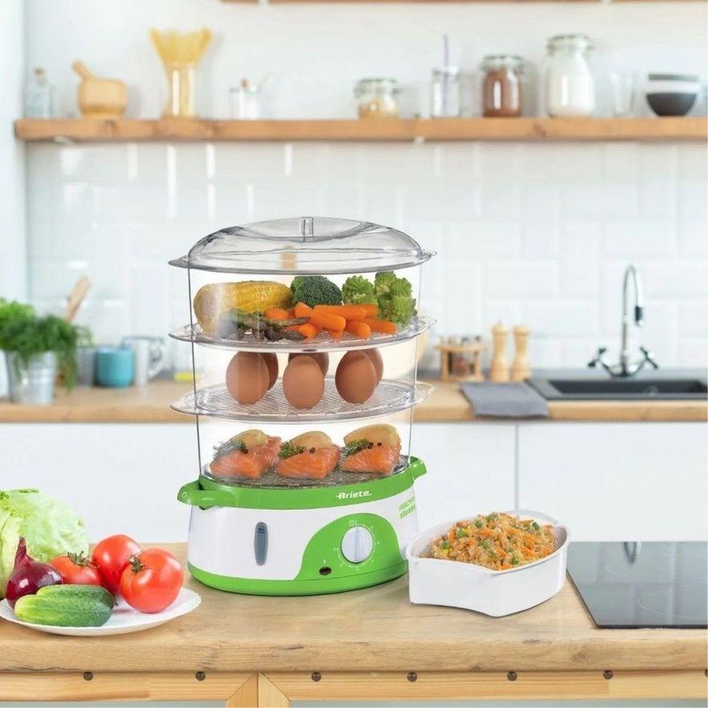 Panela à Vapor Elétrica 911 Healthy Steam 800W 220V ArieteO Healthy Steam Ariete traz a técnica de cozimento a vapor para o dia a dia de forma prática, rápida e muito mais saudável. Em apenas 40 segundos o vapor está pronto para preparar arroz, carnes, peixes, frutos do mar, legumes e ovos mantendo nutrientes, textura e sabor, sem excesso de óleo ou gordura. Com 3 bandejas empilháveis + recipiente próprio para arroz, é possível cozinhar diferentes alimentos ao mesmo tempo, ideal para quem busca alimentação equilibrada com menos processos e mais eficiência. O tanque possui nível de água visível e pode ser abastecido até durante o uso, facilitando a rotina e tornando o preparo mais simples. Uma solução inteligente para refeições leves, nutritivas e completas para toda a família.Panela à Vapor Elétrica 911 Healthy Steam 800W 220V Ariete - InformaçõesAlimentos mais saudáveis
