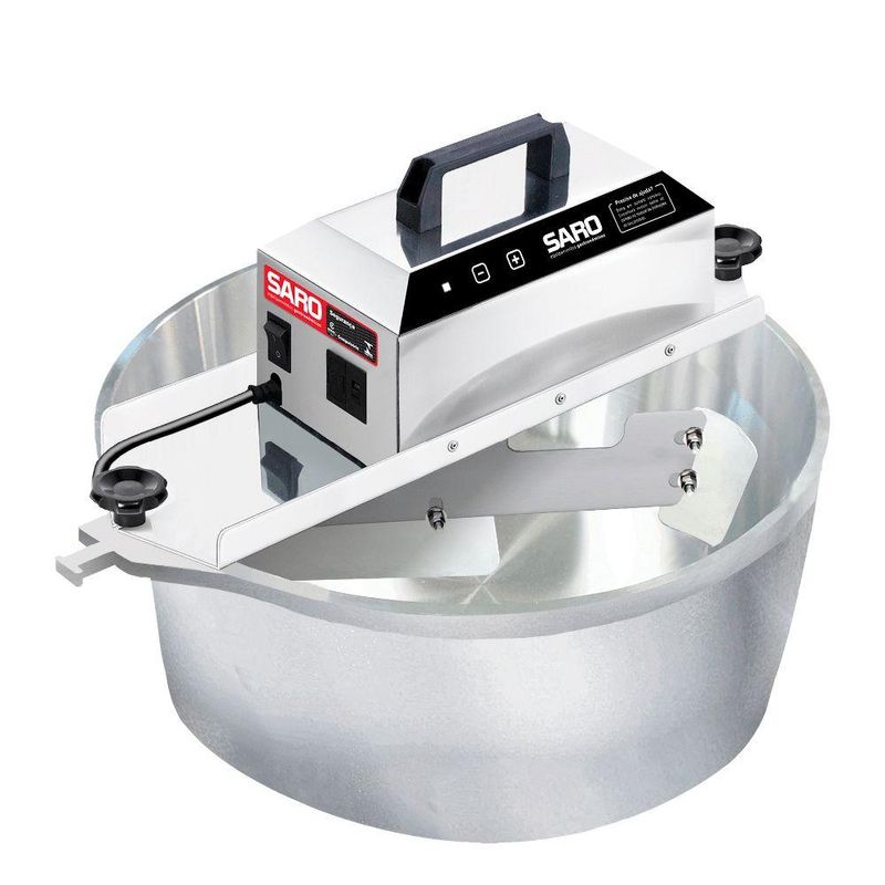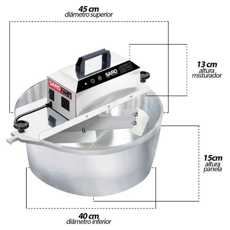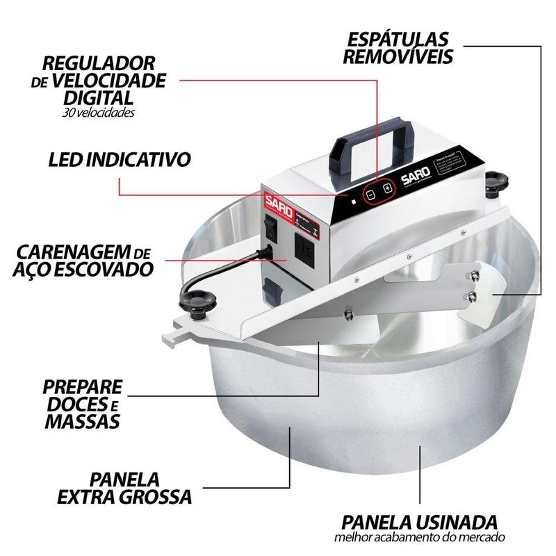 A Saro é líder na comercialização de panelas para doces e salgados, e está trazendo para você a Panela misturadora de doces e salgados com capacidade de até 21 litros.A panela Saro é a única na sua categoria que possui velocidade digital, ela apresenta dois botões, um para aumentar e outro para diminuir a velocidade, desta forma, proporcionando muito mais precisão e praticidade ao regular a velocidade desejada. A panela misturadora de doces e salgados possui um motor de alta potência, a única que te permite preparar todo tipo de doce, como brigadeiros por exemplo, podendo também preparar massas para churros, coxinha, risoles, croquete, quibe, empada, pastel, pizza, pão e muito mais.E para garantir a qualidade do produto, este equipamento é certificado pelo Inmetro.Características: