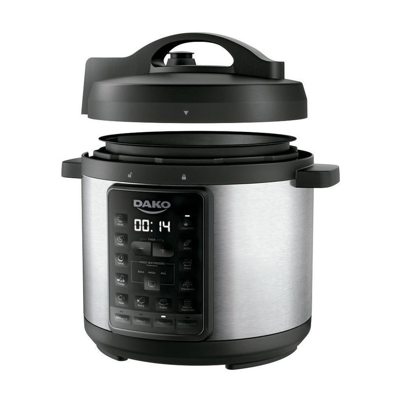 Panela de Pressão Elétrica Dako 6 Litros – Preto FoscoDescrição do Produto:Quem nunca teve medo de usar uma panela de pressão, que atire a primeira pedra. A panela de pressão já foi considerada um dos itens mais temidos da cozinha. Barulhenta e com o risco de explodir, não é à toa que muitos evitavam utilizá-la. Mas isso ficou no passado.Agora, a Dako apresenta sua panela de pressão elétrica com 6 litros de capacidade, que oferece todos os benefícios da panela de pressão convencional: cozinha rápido e mantém os alimentos no ponto ideal, sem riscos de explosão e sem barulho.Com a Panela de Pressão Elétrica Dako, você tem mais sabor e menos louça para lavar, graças à sua função exclusiva que permite cozinhar com a tampa aberta e sem pressão, permitindo fazer todas as etapas de preparo em uma única panela. Tudo isso, sem perder o fundinho tempero.Ela é também equipada com um suporte para cozimento a vapor, de legumes a receitas orientais. Além disso, é perfeita para o seu dia a dia, com um painel descomplicado, fácil de usar, e 11 receitas pré-programadas que se encaixam perfeitamente na sua rotina.Com a função de manter aquecido, você pode servir as refeições sem se preocupar em reaquecer a comida. Se desejar levar a panela à mesa, basta desconectar o cabo. Na hora de comparar, você vai perceber que a Dako surpreende além dos fogões.Atributos e Benefícios:9 níveis de – Não explode