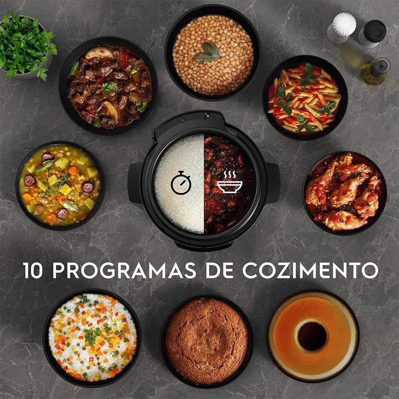 Possui 10 programas de cozimento em um único produto, além de garantir segurança na hora do preparo para você e toda sua família, as funções predefinidas ajudam a alcançar resultados ainda melhores. Você pode preparar arroz, feijão, frango, carne, macarrão, sopa, bolo, pudim e muito mais.