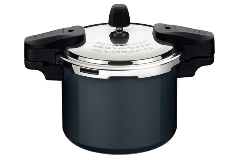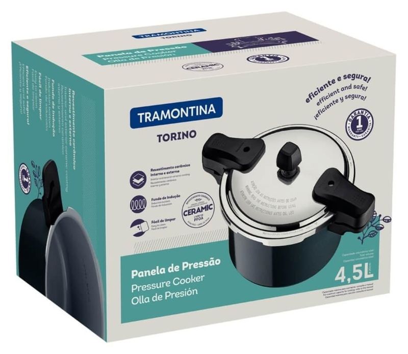 Um item essencial para garantir praticidade para o preparo das suas refeições, é sem dúvida, a panela de pressão Tramontina Torino em alumínio com revestimento interno e externo cerâmico verde petróleo 20 centímetros 4,5 litros. Ela é perfeita para a hora de preparar aquele delicioso feijão para seu almoço do dia a dia, pois conta com corpo de alumínio com espessura de 3,2 milímetros, que torna o cozimento dos alimentos mais rápido e uniforme. Seu revestimento é cerâmico e vem com tampa de alumínio com acabamento externo polido e interno satinado, com travas que oferecem maior segurança durante sua utilização. Suas alças são em baquelite antitérmico, material que reduz a propagação de calor e oferece maior segurança e conforto durante o manuseio. Ela ainda pode ser utilizada em fogões a gás, elétricos, vitrocerâmicos e indução, o que garante maior versatilidade na cozinha. Escolha Tramontina e garanta experiências inesquecíveis na hora de cozinhar!