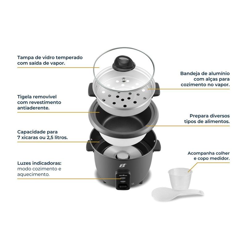 Com capacidade para 7 xícaras, ela garante que toda a família possa saborear refeições caseiras e nutritivas. Possui tampa de vidro temperado que permite visualizar cada etapa do cozimento, enquanto a saída de vapor garante que seus alimentos fiquem no ponto certo.