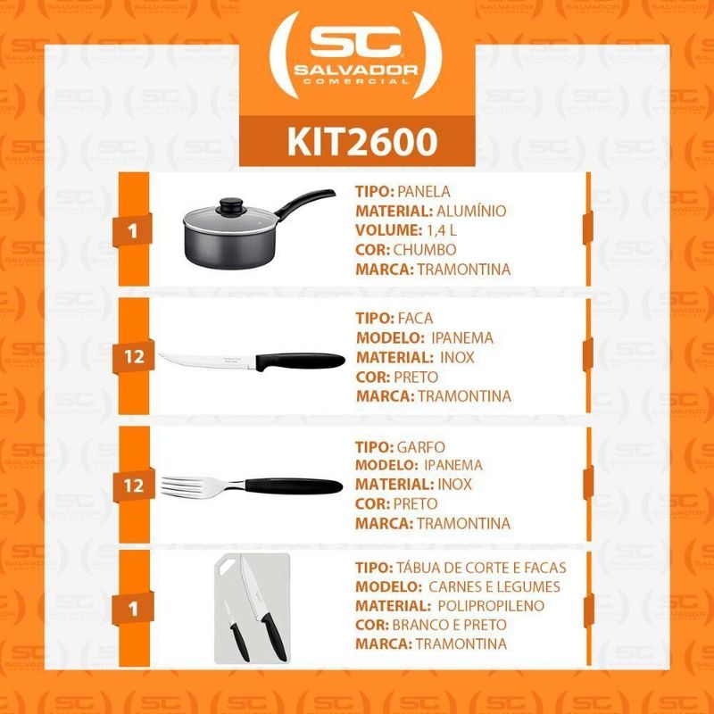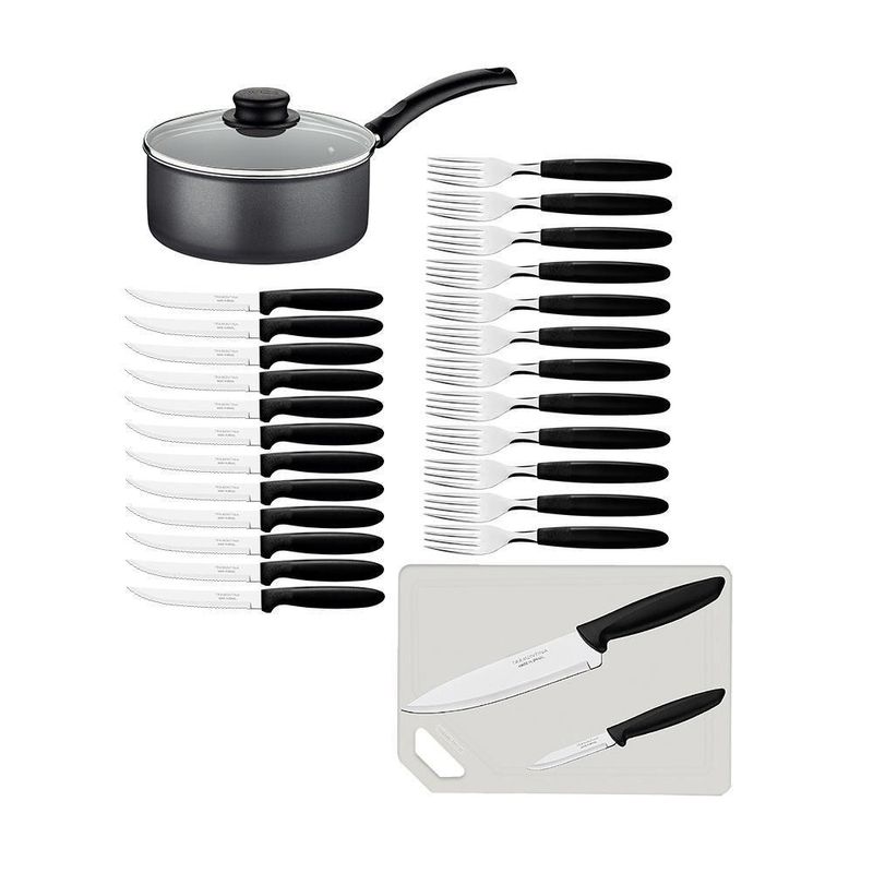 MUITO IMPORTANTE:CONFERIR PRODUTOS NO ATO DO RECEBIMENTO. NÃO ACEITAR PRODUTOS COM EMBALAGEM VIOLADA (AMASSADO, RASGADO, ABERTO, QUEBRADO, ETC), A RECUSA DEVE SER FEITA NO ATO Componentes do Kit:1 - Panela Turim Alumínio Antiaderente Chumbo 16cm 1,4L PTC3 - Tramontina12 - Faca para Churrasco Ipanema com Lâmina em Aço Inox 5 Pol Cabo Preto FPTOP - Tramontina12 - Garfo de Mesa Ipanema com Lâmina em Aço Inox Cabo Preto GPTOP - Tramontina1 - Kit Para Carnes e Legumes Plenus Lâminas Inox Cabos Preto e Tábua 3 Peças Panela Turim Alumínio Chumbo Antiaderente 1,4l + Cojunto Ipanema 24pc + Tábua e Facas - Tramontina Eleve sua experiência culinária com o Conjunto Tramontina, a escolha perfeita para quem busca praticidade e desempenho profissional. Projetado para cozinheiros domésticos e chefs, este kit multifuncional simplifica sua rotina na cozinha. A panela de alumínio antiaderente assegura que os alimentos não grudem, um fator crucial para preparos sem complicações. A tábua e as facas proporcionam cortes precisos, tornando cada receita uma tarefa mais fácil e agradável. O revestimento antiaderente da panela facilita a limpeza, enquanto o conjunto de 24 talheres Ipanema, em aço inox, oferece resistência à corrosão e beleza. Fabricado com materiais de alta qualidade, como o alumínio e o aço inox, este conjunto é construído para resistir ao uso diário. As facas com lâminas de aço inoxidável garantem um corte suave e eficiente. A versatilidade deste conjunto também ajuda a otimizar o espaço na sua cozinha. Não perca a chance de transformar a maneira como você cozinha. Adquira agora o Conjunto Tramontina e eleve o nível das suas refeições! Especificações Panela:- Capacidade: 1,4L;- Alumínio com 1,2mm de espessura;- Revestimento anti-aderente;- Altura com tampa e cabo: 13,9cm;- Altura somente com tampa: 14,4cm;- Diâmetro: 16cm;- Comprimento total: 31,9cm;- Não utilizar em temperaturas superiores à 260°C. Especificações Faca Churrasco:- Para suas refeições diárias ficarem ainda melhor, você precisa contar com a Faca para Churrasco Tramontina Ipanema com Lâmina em Aço Inox e Cabo de Polipropileno Preto 5 polegadas.- Ideal para lhe acompanhar nas principais refeições do dia, ela é produzida com lâmina em aço inox, que garante mais resistência e durabilidade, além de proporcionar um corte perfeito.- Seu cabo na cor preta é feito em polipropileno e proporciona um manuseio muito mais confortável, além de ser muito sofisticado.- A faca ainda é muito fácil de limpar e pode ir à máquina de lavar louças.- Mais um item Tramontina pensado especialmente em você!- A lâmina de aço inox tem maior durabilidade do fio devido ao tratamento térmico.- O cabo de polipropileno possui maior resistência e durabilidade.- Pode ir à máquina de lavar louças facilitando seu dia a dia. Especificações Garfos:- O Garfo de Mesa Tramontina Ipanema com Lâmina em Aço Inox e Cabo de Polipropileno Preto é aquele talher que todo mundo ama, pois combina com todos os estilos de mesa.- Perfeito para uso diário, ele tem lâmina produzida em aço inox com espessura que fornece maior resistência e durabilidade.- Seu cabo é em polipropileno na elegante cor preta e proporciona um manuseio super confortável, além de garantir uma mesa muito mais estilosa.- É muito fácil de limpar e pode ir à máquina de lavar louças.- Um produto especial que sua casa merece!- A lâmina de aço inox garante maior resistência devido a espessura do aço e a estampagem da lâmina.- O cabo de polipropileno possui maior resistência e durabilidade.- Pode ir à máquina de lavar louças facilitando seu dia a dia. Especificações Kit Lâminas:- Linha: Plenus;- Composição do Kit: 1 faca para carnes com lâmina em aço inox, 1 faca para legumes com lâmina em aço inox, 1 tábua de corte em polipropileno na cor branca;- Material das Lâminas: Aço inoxidável com tratamento térmico, proporcionando maior durabilidade do fio;- Material dos Cabos: Polipropileno na cor preta, oferecendo resistência, durabilidade e conforto no manuseio;- Tábua de Corte: Fabricada em polipropileno branco com proteção antimicrobiana, contribuindo para a higiene durante o preparo dos alimentos;- Compatibilidade com Lava-Louças: Todas as peças podem ser lavadas em máquina de lavar louças, facilitando a limpeza no dia a dia;- Antes da primeira utilização, lave bem as peças e seque-as completamente;- Manuseie com cuidado produtos cortantes e perfurantes, mantendo-os fora do alcance de crianças;- Para maior durabilidade, recomenda-se secar bem os utensílios antes de guardá-los, mesmo após lavagem em máquina;- Descarte os produtos e embalagens conforme as orientações de reciclagem vigentes; Cor: Cinza | É kit de fábrica: Não | Quantidade de Peças: 28 | Materiais: Alumínio | Adequado para fogão de indução: Não | Com revestimento antiaderente: Sim