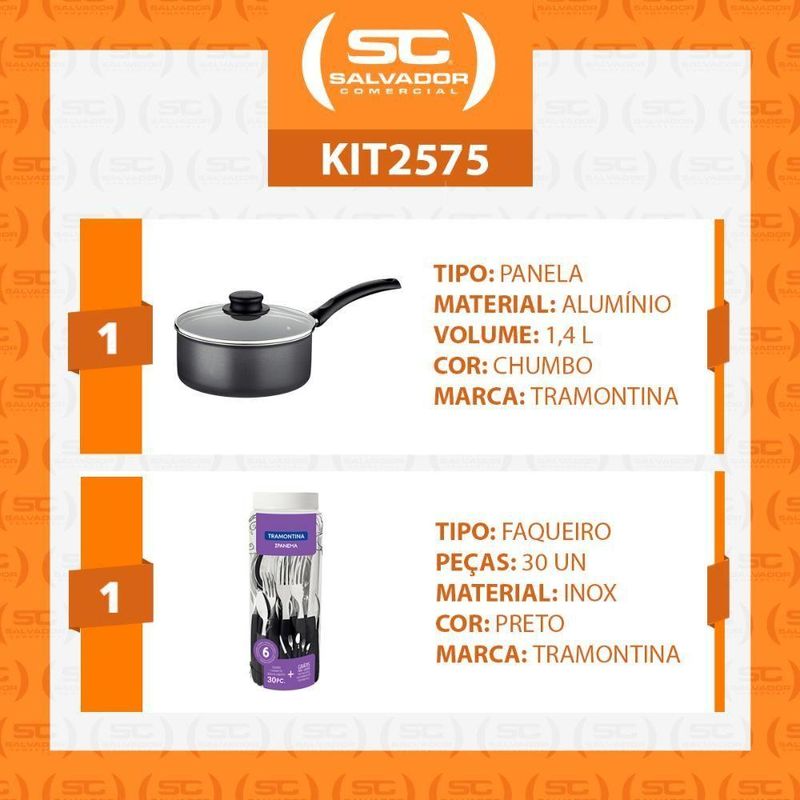 MUITO IMPORTANTE:CONFERIR PRODUTOS NO ATO DO RECEBIMENTO. NÃO ACEITAR PRODUTOS COM EMBALAGEM VIOLADA (AMASSADO, RASGADO, ABERTO, QUEBRADO, ETC), A RECUSA DEVE SER FEITA NO ATO Componentes do Kit:1 - Panela Turim Alumínio Antiaderente Chumbo 16cm 1,4L PTC3 - Tramontina 1 - Faqueiro Inox 30Pc Ipanema Preto - Tramontina Panela Turim Alumínio Chumbo Antiaderente 1,4L PTC + Faqueiro Ipanema Preto 30pc - Tramontina Descubra sua experiência gastronômica com o Kit de Panela e Faqueiro Tramontina, a escolha ideal para quem procura funcionalidade no dia a dia e um toque de requinte. Perfeito para quem está montando a casa, este conjunto transforma a cozinha, tornando cada refeição um evento especial. A panela é ideal para preparar pratos deliciosos sem complicação, enquanto o faqueiro complementa a mesa com estilo. A panela com revestimento antiaderente garante que os alimentos não grudem, um detalhe crucial para uma limpeza rápida e sem esforço. A panela Turim em alumínio com revestimento antiaderente permite um cozimento uniforme e sem grudar. O faqueiro Ipanema, com suas lâminas de aço inox e cabos de polipropileno, oferece durabilidade e conforto no manuseio. O kit é construído com materiais de alta qualidade, oferecendo resistência para uso contínuo e diário. O design moderno e a facilidade de limpeza de ambos os itens otimizam seu tempo na cozinha. Não perca a oportunidade de renovar sua casa com itens essenciais e elegantes. Adquira agora o Kit Tramontina e desfrute de refeições preparadas e servidas com perfeição! Especificações Panela:- Capacidade: 1,4L;- Alumínio com 1,2mm de espessura;- Revestimento anti-aderente;- Altura com tampa e cabo: 13,9cm;- Altura somente com tampa: 14,4cm;- Altura interna: 6,7cm;- Diâmetro: 16cm;- Comprimento total: 31,9cm;- Garantia de 90 dias para vícios ou defeitos de fabricação;- Não utilizar em temperaturas superiores à 260°C. Especificações Faqueiro:- Antes da primeira utilização, lave bem as peças e seque-as.- Produto cortants e perfurantes, tenha cuidado e mantenha sempre fora de alcance das crianças.- Para maior durabilidade dos produtos, recomenda-se secar bem antes de gaurar, mesmo após lavagem em máquinas.- Para descarte dos produtos e embalagem, sega as orientações de reciclagem vigente. Conteudo:6 Faca Lâmina 11,2cm - medida 21cm6 Garfos de mesa. - medida 19cm6 Colheres de mesa. - medida 19cm6 Garfos para sobremesa. - medida 14cm6 Colheres para chá. - medida 14cm Cor: Cinza | É kit de fábrica: Não | Quantidade de Peças: 31 | Materiais: Alumínio | Adequado para fogão de indução: Não | Com revestimento antiaderente: Sim