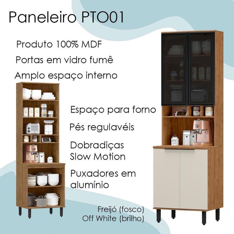 Paneleiro PTO01 4 Portas, design sofisticado e máxima funcionalidade! Uma peça com uma qualidade surpreendente. Sua estrutura 100% MDF, com chapas de 15mm e tampo de 22mm que garante resistência e durabilidade para o dia a dia. Estilo moderno, se destaca pelas duas portas em vidro fumê, emolduradas por um perfil elegante em MDF preto fosco. Além disso, oferece um espaço estratégico para forno ou micro-ondas, otimizando a organização de sua cozinha. Para maior segurança, todas portas contam com dobradiças Slow Motion, para um fechamento suave e silencioso, além de puxadores em alumínio que reforçam uma estética sofisticada. Os pés com regulagem garantem estabilidade em qualquer tipo de superfície. A escolha ideal! Este móvel chegará na sua casa separado em 02 volumes.