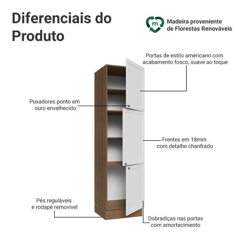 A Madesa se dedica à sustentabilidade com várias iniciativas: temos uma usina própria que gera energia para uma das fábricas. Priorizamos fornecedores responsáveis com o meio ambiente. Todo o plástico na produção é reciclado, e as sobras também são reaproveitadas. Investimos no desenvolvimento de nossos colaboradores e em ações que beneficiem a comunidade.COR: Branco | Garantia: 3 meses contra de fabricação | Dimensões - Altura: 225 cm | Dimensões - Largura: 60 cm | Dimensões - Profundidade: 52 cm | Produto: Cozinha | Marca: Madesa | Peso do Produto: 52 kg | Material: MDP | RBN: Casa/Móveis/Móveis de Cozinha | Estado de Origem: RS | Material para Filtro: MDP | Conteúdo da embalagem: 1 Paneleiro | Instruções/Cuidados: Utilize um pano limpo, levemente umedecido e seque em seguida a superfície. Não usar produtos químicos ou abrasivos para a limpeza. Recomendamos polir seu móvel com lustra-móveis duas a três vezes por ano. | Quantidade de gavetas: 0 | Quantidade de portas: 3 | Produto precisa de Montagem?: Sim, sugerimos a contratação do nosso de montagem (para os CEPs em que o está disponível) ou de algum experiente de sua preferência | Inclui tampo: Sim | Altura do Produto com Embalagem (cm): 70,6 | Largura Produto Com Embalagem (cm): 61,1 | Comprimento Produto Com Embalagem (cm): 214,8 | Peso Produto Com Embalagem (Kg): 52,22 | Dimensões do item P x L x A (item_depth_width_height): depth#value=52;depth#unit=centimeters;height#value=225;height#unit=centimeters;width#value=60;width#unit=centimeters | Nome do Simples no Fornecedor: Paneleiro 60 cm 3 Portas Rustic/Branco Vik Madesa | Fabricante: Madesa | Tipo de móveis de cozinha: Balcão | Linha: Vik | Materiais do corpo: MDP | Materiais das portas: MDP | Quantidade de caixas de embalagem: 4 | Bullet Point 0: Dimensões: 225 cm altura x 60 cm largura x 52 cm profundidade | Bullet Point 1: Inspiração no estilo americano, frentes com acabamento chanfrado e textura fosca suave ao toque | Bullet Point 2: Puxadores ponto em ouro envelhecido e portas com fechamento suave | Bullet Point 3: A combinação perfeita entre design clássico e elementos modernos | É Frágil: Não | Quantidade de Itens: 1 | Certificação de teste externa: Sim | Modelo: G266076EVK | Precisa de baterias ou pilhas: Não | da peça: G266076EVK | Componetes Incluidos: Portas | Preço sugerido sem impostos: | Peso do Item: ;unit=kilograms | Descrição do Tamanho: 225 cm x 60 cm x 52 cm | Inclui manual de montagem: Sim Cor: Rustic/Branco