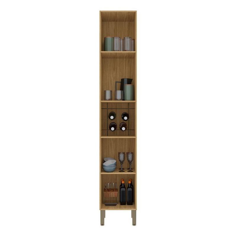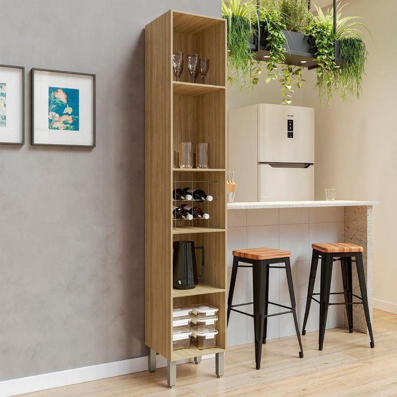 A porta superior de vidro, com bordas em ABS e fecho magnético, é um verdadeiro destaque, agregando um visual único ao Paneleiro Cristaleira. Enquanto a porta inferior conta com puxador em ABS, ambas possuem dobradiças metálicas com amortecedor, que proporciona um fechamento suave e livre de impactos. O Suporte Adega acomoda até quatro garrafas, oferecendo um toque especial e valorizando ainda mais o Paneleiro de Cozinha.