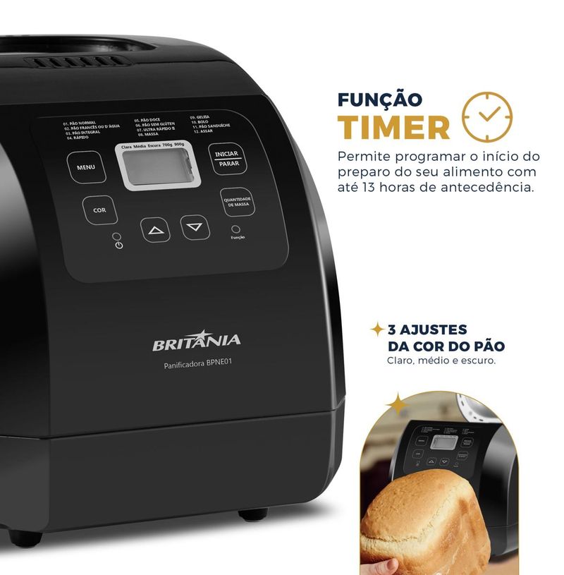 Saboreie pães fresquinhos a qualquer hora com a Panificadora Britânia Digital 12 Programas 3L BPNE01 Imagine acordar com o aroma irresistível de pão quentinho te esperando.