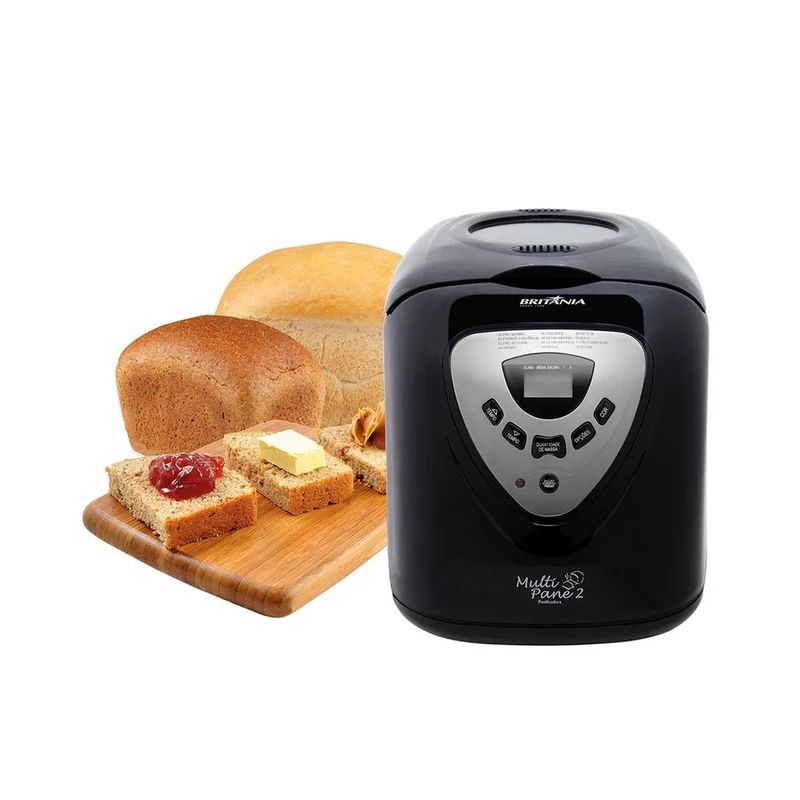 Você adora pão caseiro, mas só de pensar no trabalho que dá para fazer, desanima? Então a Panificadora Britânia Multipane é a solução ideal para você ter pães fresquinhos todos os dias, sem ter que pôr a mão na massa! Ela faz 4 tamanhos de pão: 450, 600, 900 e 1200 gramas, conforme você desejar. Se você gosta de pães mais escurinhos, pode selecionar essa opção e pronto! Pois ela conta com 3 ajustes da cor do pão: claro, médio e escuro. Tem combinações de até 12 programas diferentes para você escolher, possibilitando que preparar vários tipos de pães doces e salgados, geleias, pudins, panetones e muito mais! Com função timer da Multipanevocê agende o preparo do seu pão com até 13h de antecedência e ele fique pronto na hora desejada. Possui forma removível revestida com base antiaderente, deixando a limpeza muito mais fácil. E para que você possa observar o preparo, tem visor de vidro temperado.