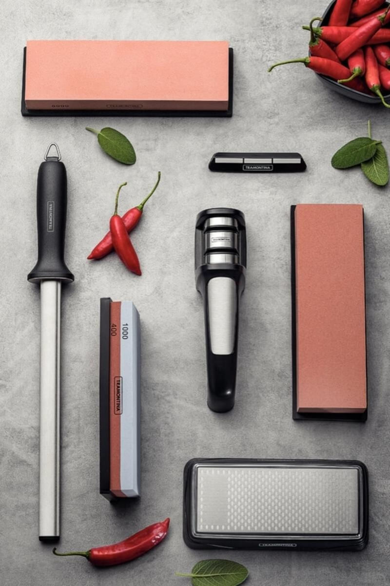 - Para evitar danos à faca, afie-a empregando uma suave pressão.